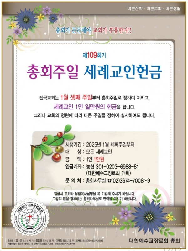 □ 시행 기간 2025년 1월 19일(주일)부터 □ 세례교인헌금 입금계좌 농협 301-0203-6988-81 예금주 대한예수교장로회(개혁) 입금 시 꼭 위 계좌를 이용해 주시고, 교회명과 담임목사님 성명을 기재해 주시기 바랍니다. 그렇지 않았으면 총회사무실(02-3674-7008)로 연락을 주시기 바랍니다. □ 헌금 봉투가 필요하신 경우 연락 주시면 보내드리겠습니다.